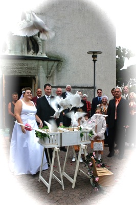 Gleich danach werden von dem Brautpaar je eine Tür an dem Taubenkorb geöffnet, so das die anderen Hochzeitstauben auch aufsteigen können. Diese fliegen nach kurzer Orientierung wieder zum Heimatschlag.